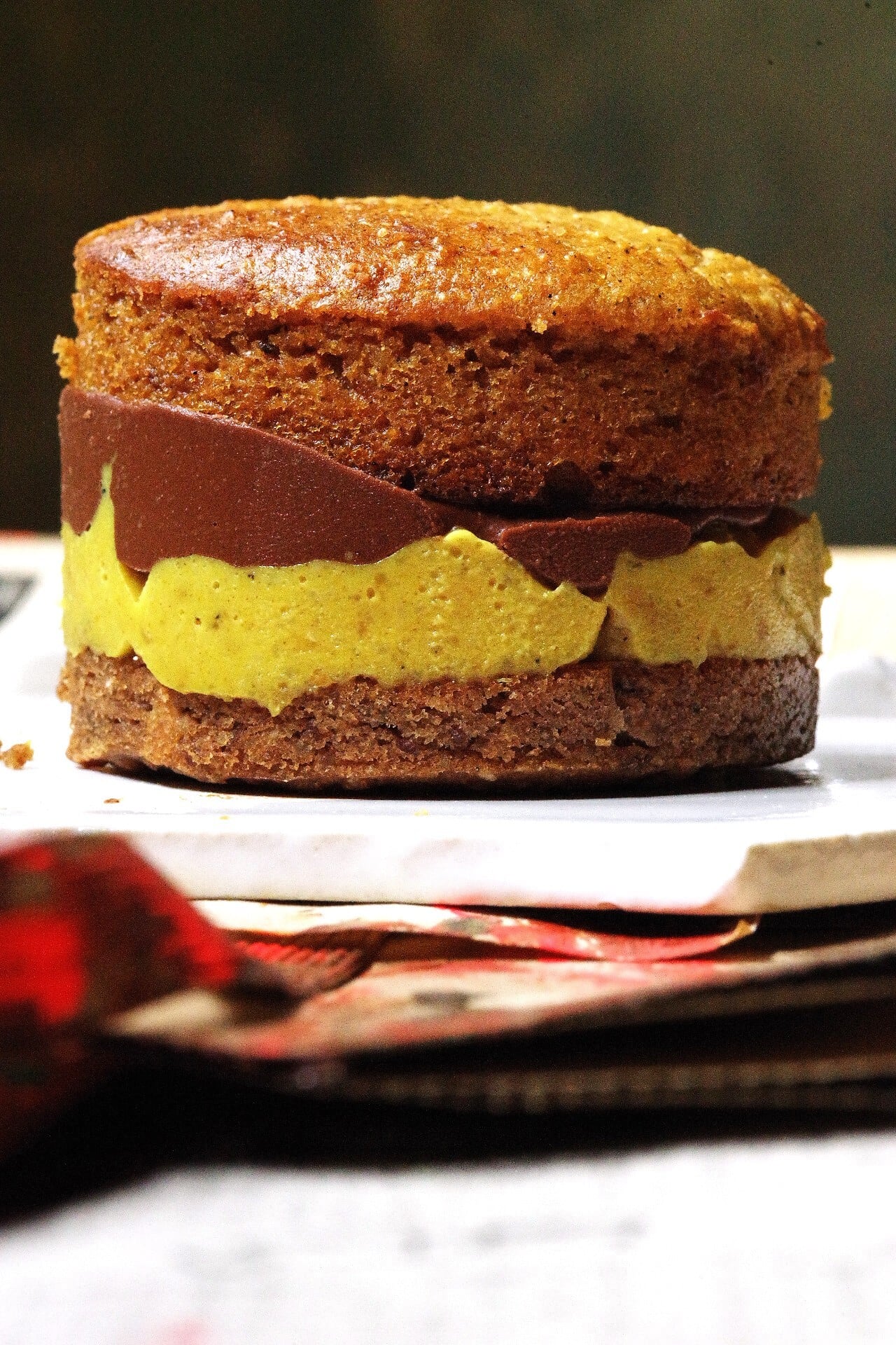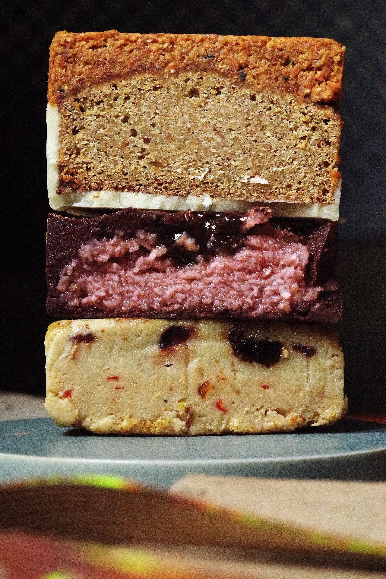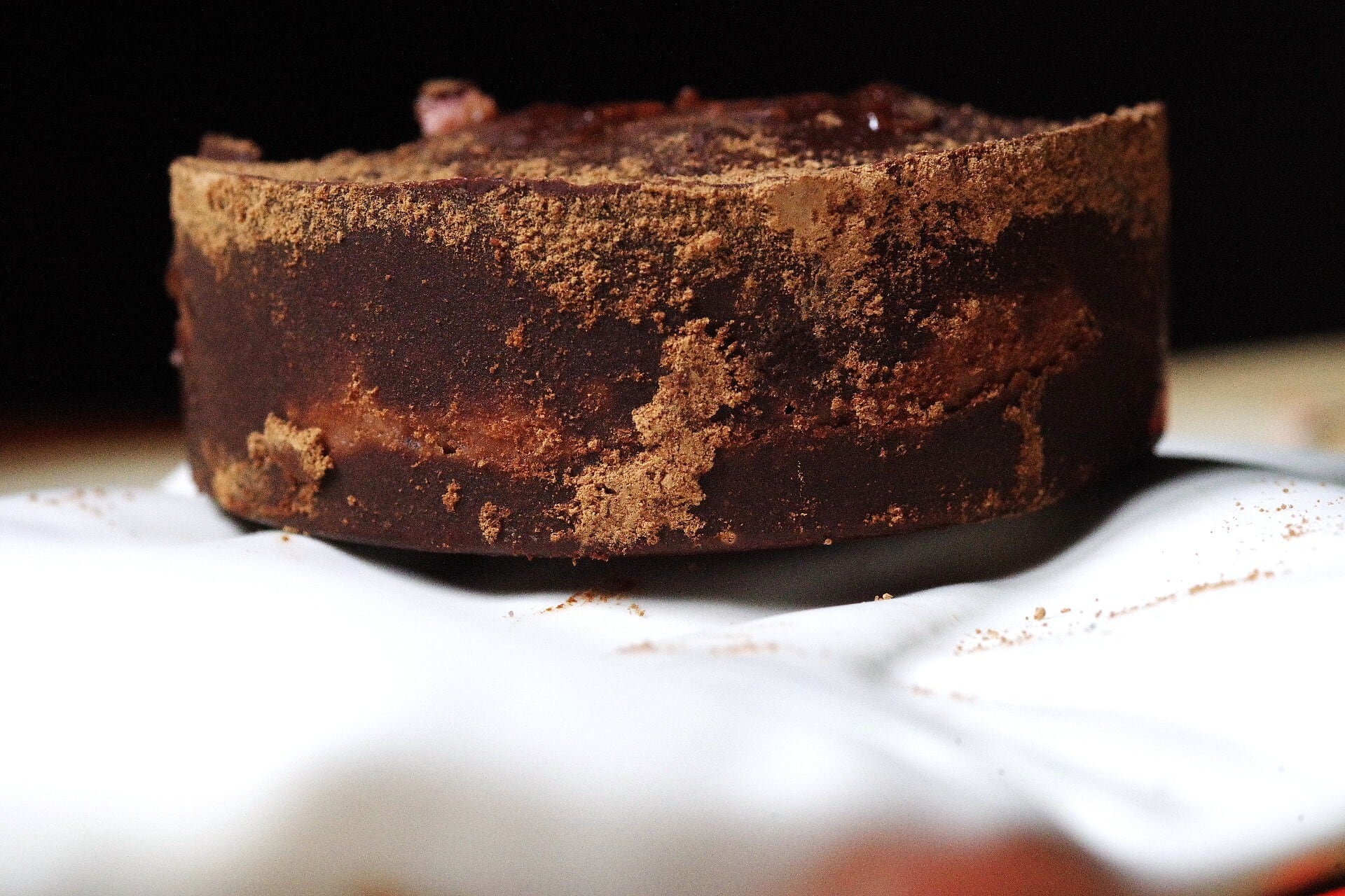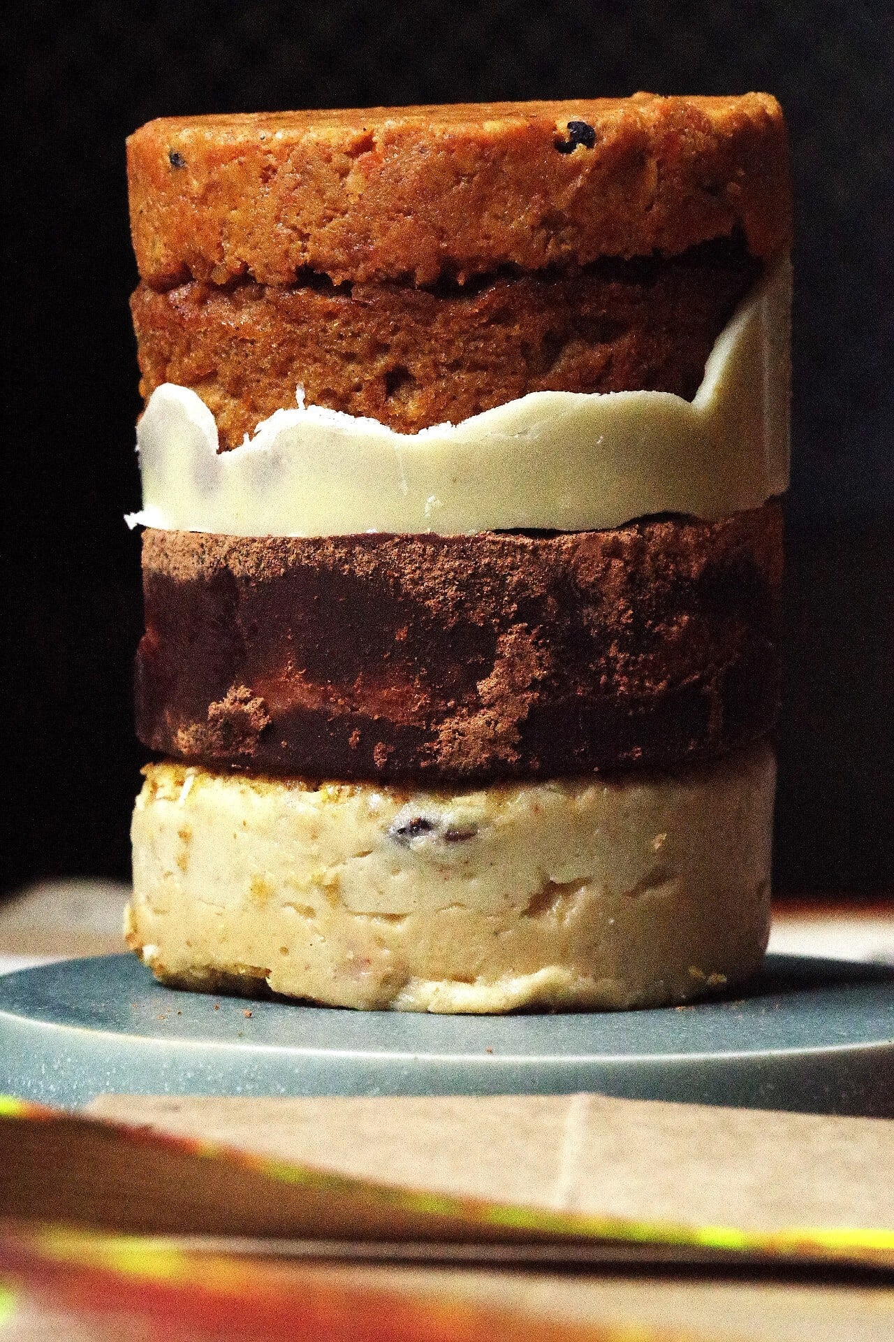 (写真 茶色と焦げ茶と白の三層積み.断面スポンジ縁ホワイトチョコ)