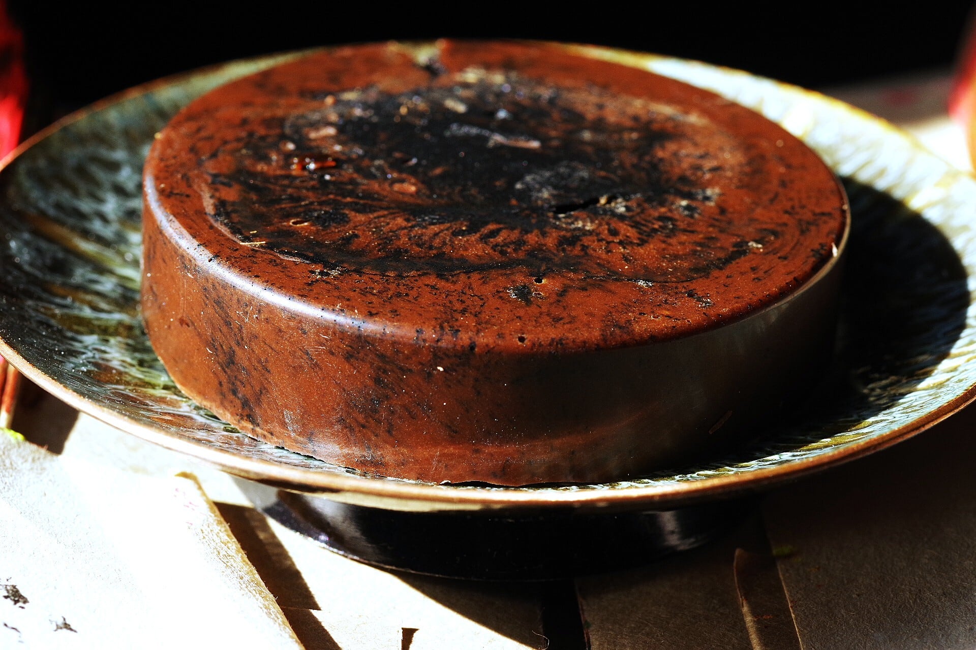 ⑥ 土曜 黒チョコイタリアン(平たい汚れたツヤ赤茶。断面イチジクプルーン黒々グロイ)