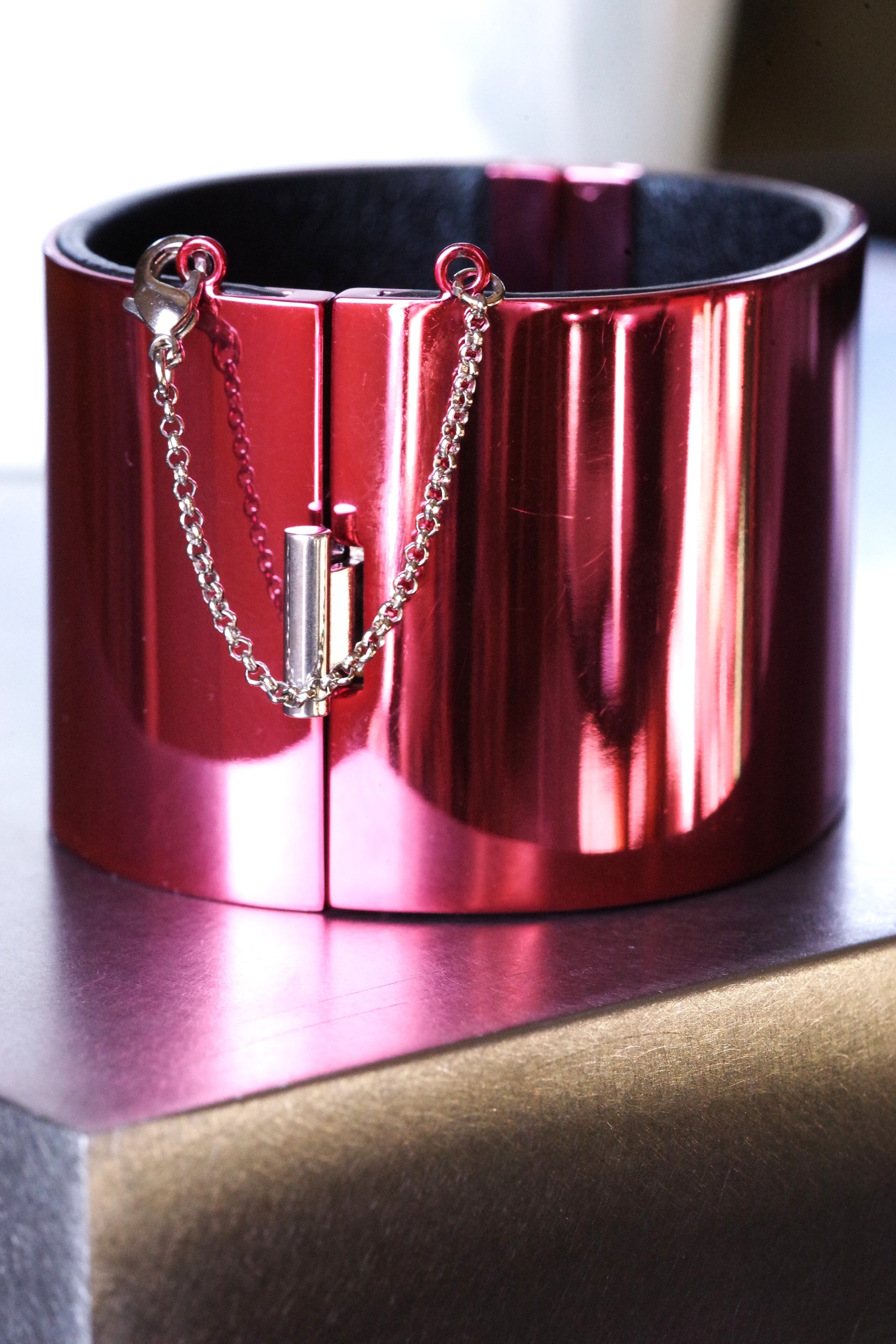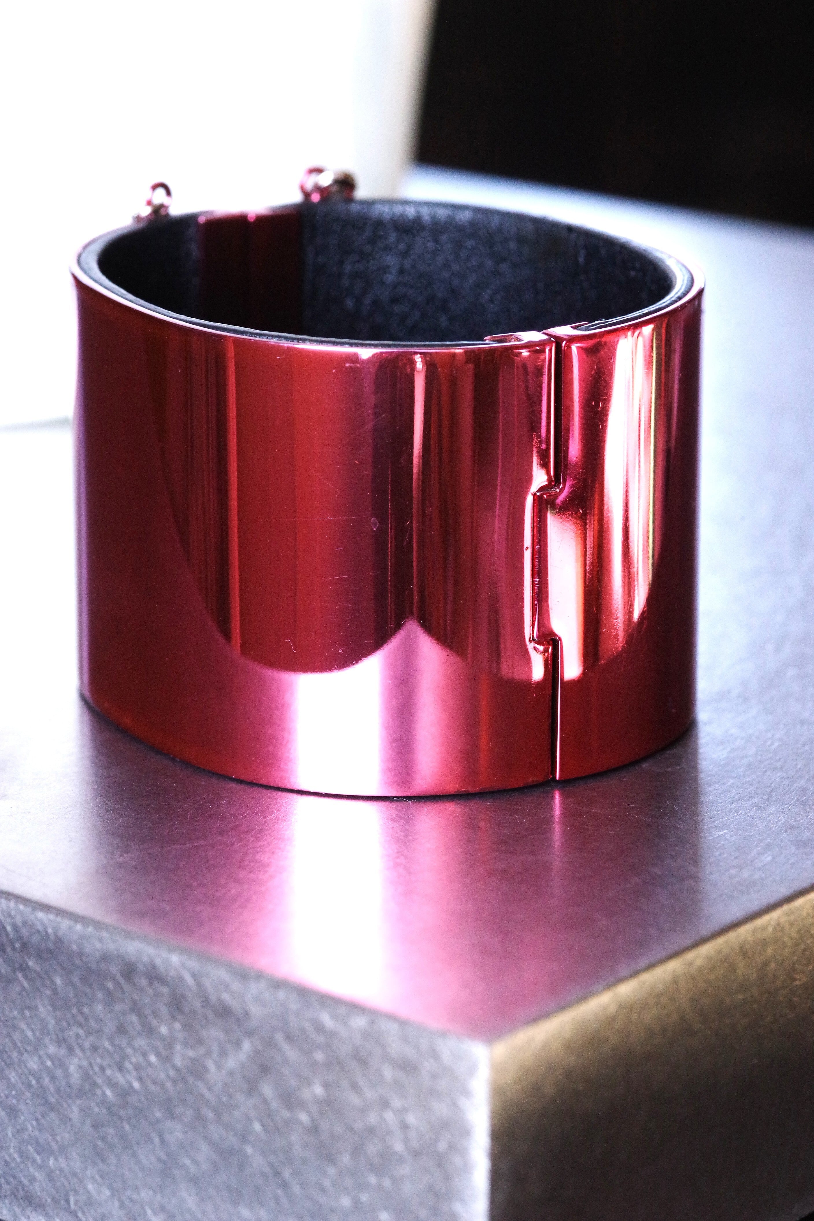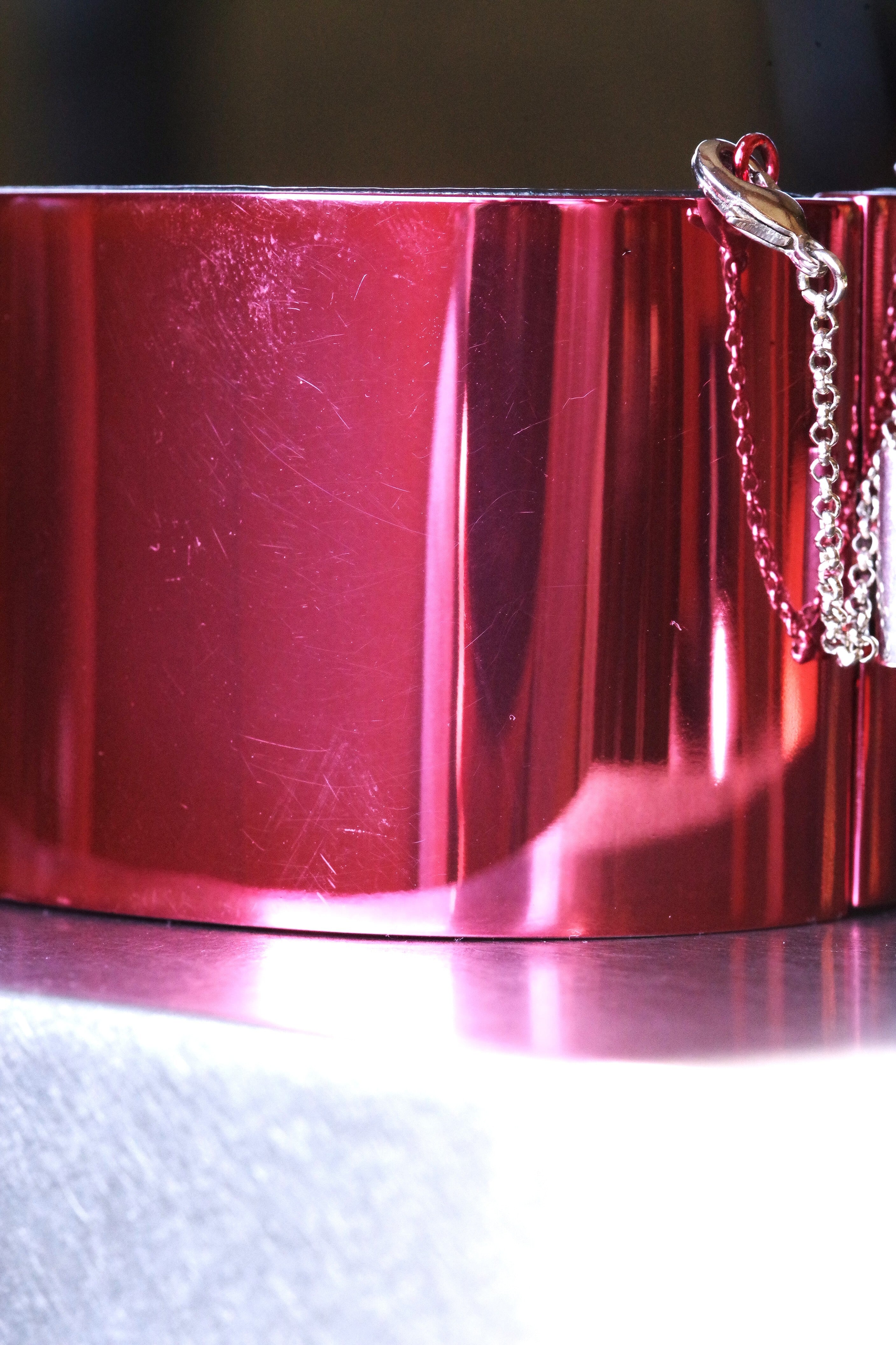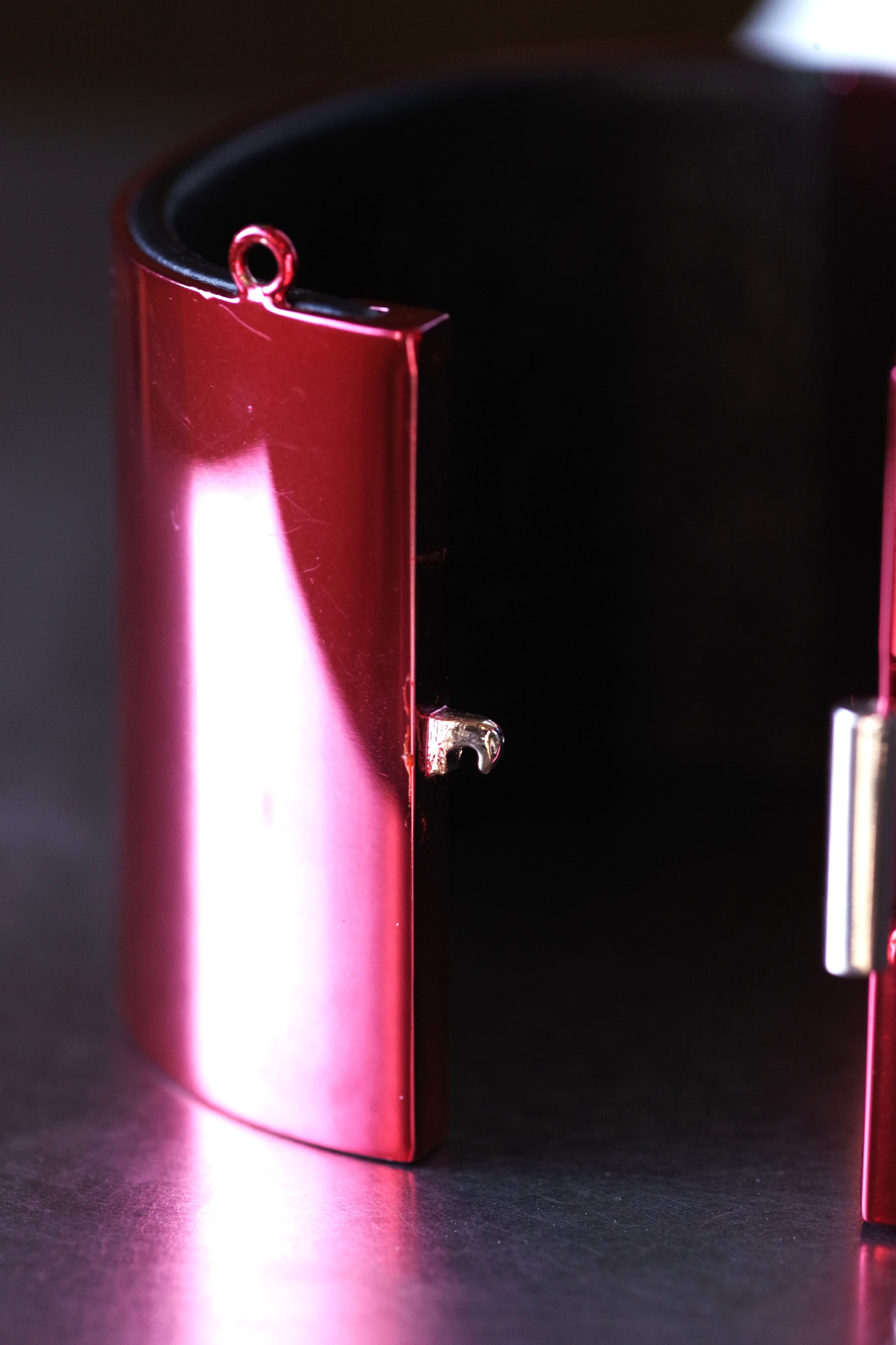 外側は、硬い素地(素材不明)を鏡面ピンクメッキしています。