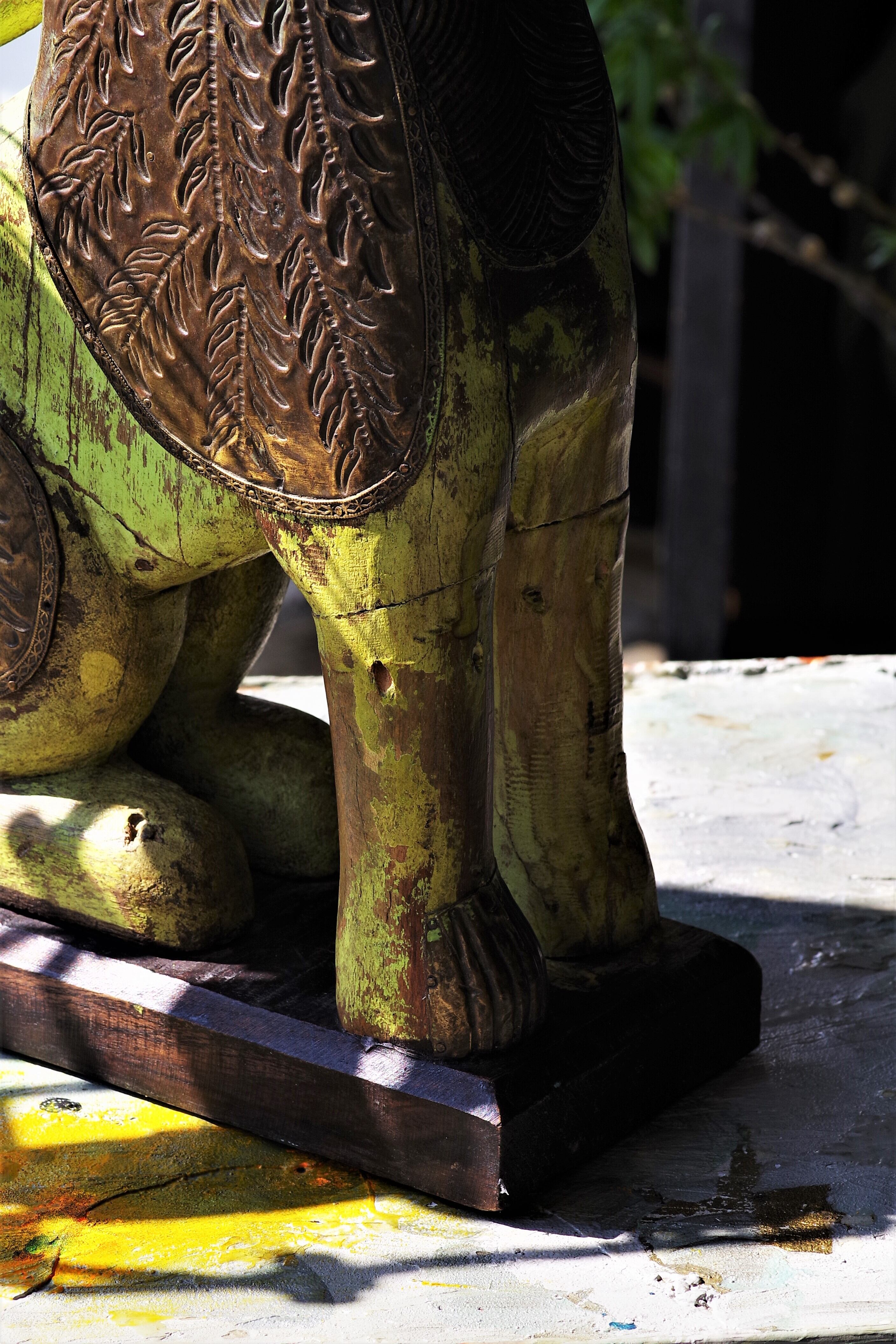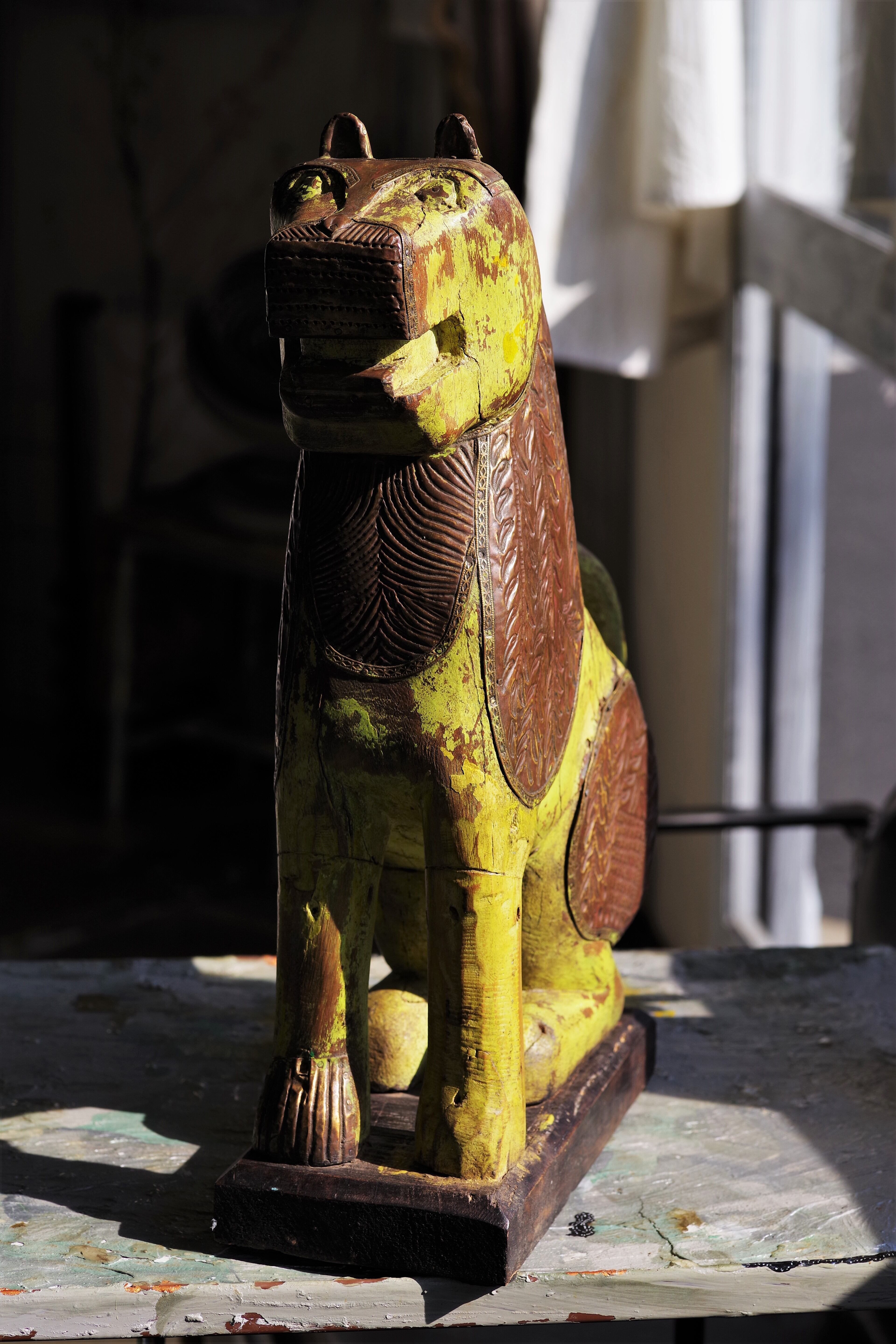 の木のライオン。塗られてます。金属の薄板が貼られています。