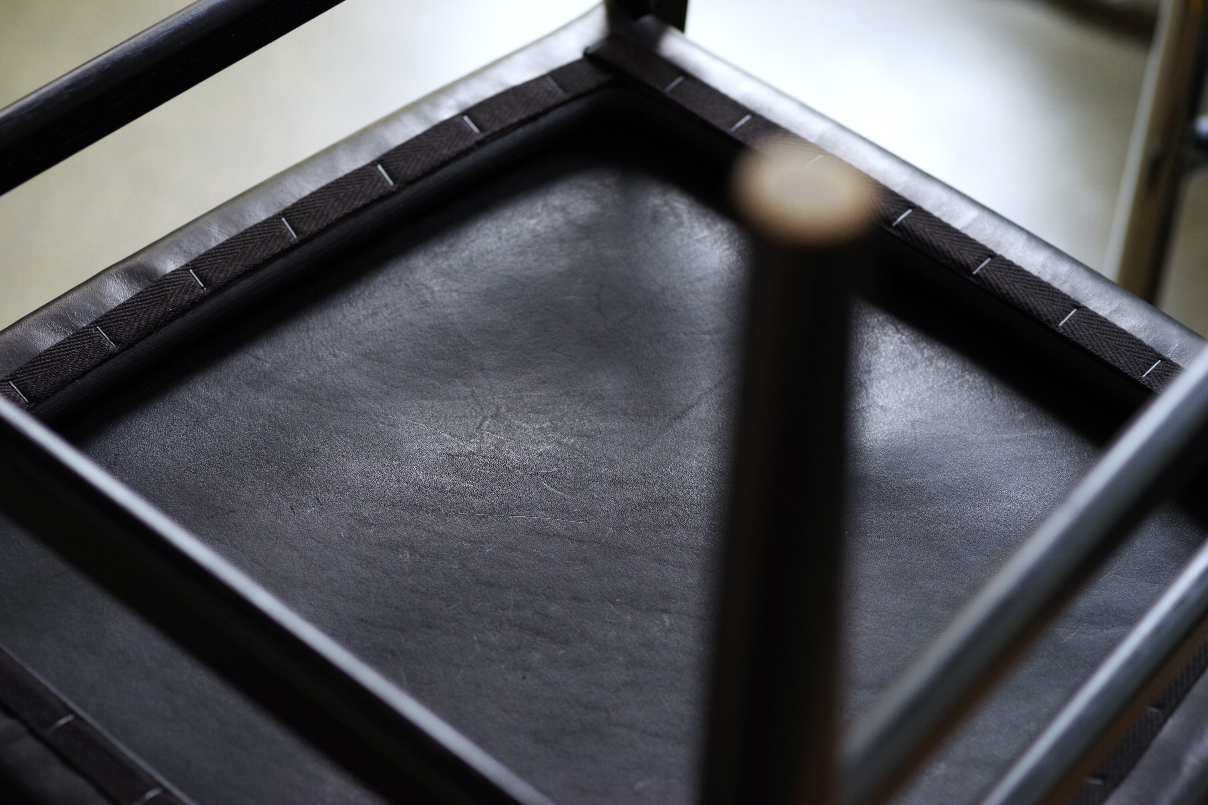 座面は 表革一枚、裏革一枚、間に耐荷非収縮シート一枚 の三層構造体。
